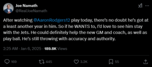 The Hall of Fame quarterback took to twitter and said that if Rodgers “wants to”, he could “definitely help the new GM and coach” as he felt that today’s performance in the Jets win left “no doubt” that Rodgers can still play.