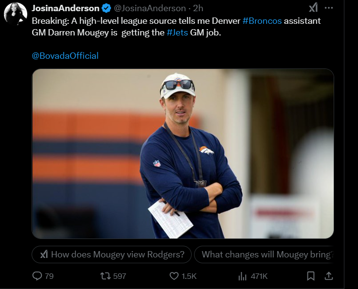 After settling on former Jets cornerback Aaron Glenn as their new head coach just a couple of day ago, the Jets have reportedly picked their next GM in Broncos exec Darren Mougey. This, according to NFL insider Josina Anderson. The report is yet to be confirmed by the team.