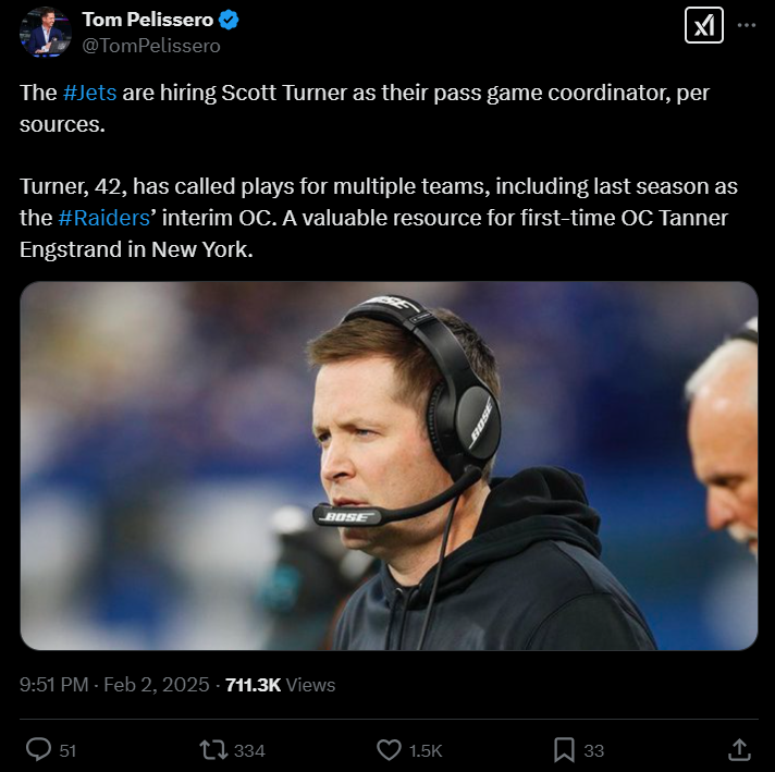 With Turner, the Jets bring in a passing game coordinator with a lot of the experience that others on the staff lack. Turner has five seasons as a coordinator under his belt and three seasons as a coordinator.