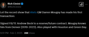 In making his first transaction as Jets General Manager by signing free agent TE/H-Back Andrew Beck, Darren Mougey adds a player knows, and obviously trusts, from their time together in Denver from 2019-2022.