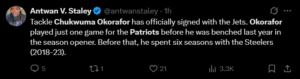 Offensive tackle Chukwuma Okorafor took the 2024 season off after being benched for a poor performance with the Patriots in week 1, but now he’s back with the New York Jets.