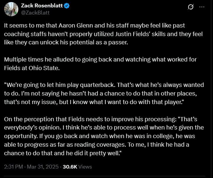 Owner of a 14-30 record as a pro, Fields’ play at Ohio State back in 2020 is still fresh in Glenn’s mind. Asked about Fields today at the annual owner’s meeting, Glenn said “If you go back and watch when he was in college, he was able to progress as far as reading coverages. To me, I think he had a chance to do that and he did it pretty well.”